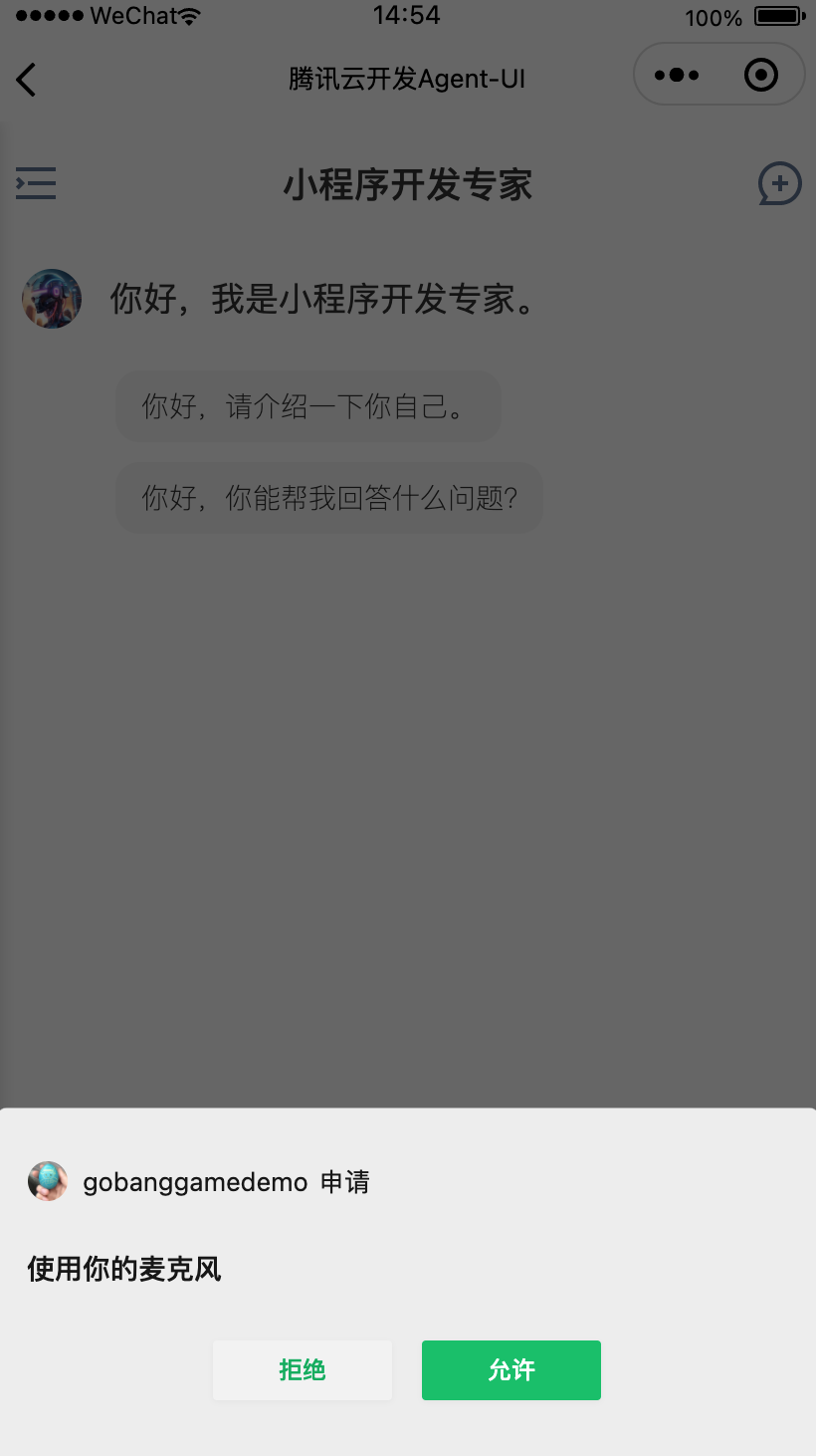 若未授予小程序使用麦克风权限,组件会进行权限申请,请同意授予