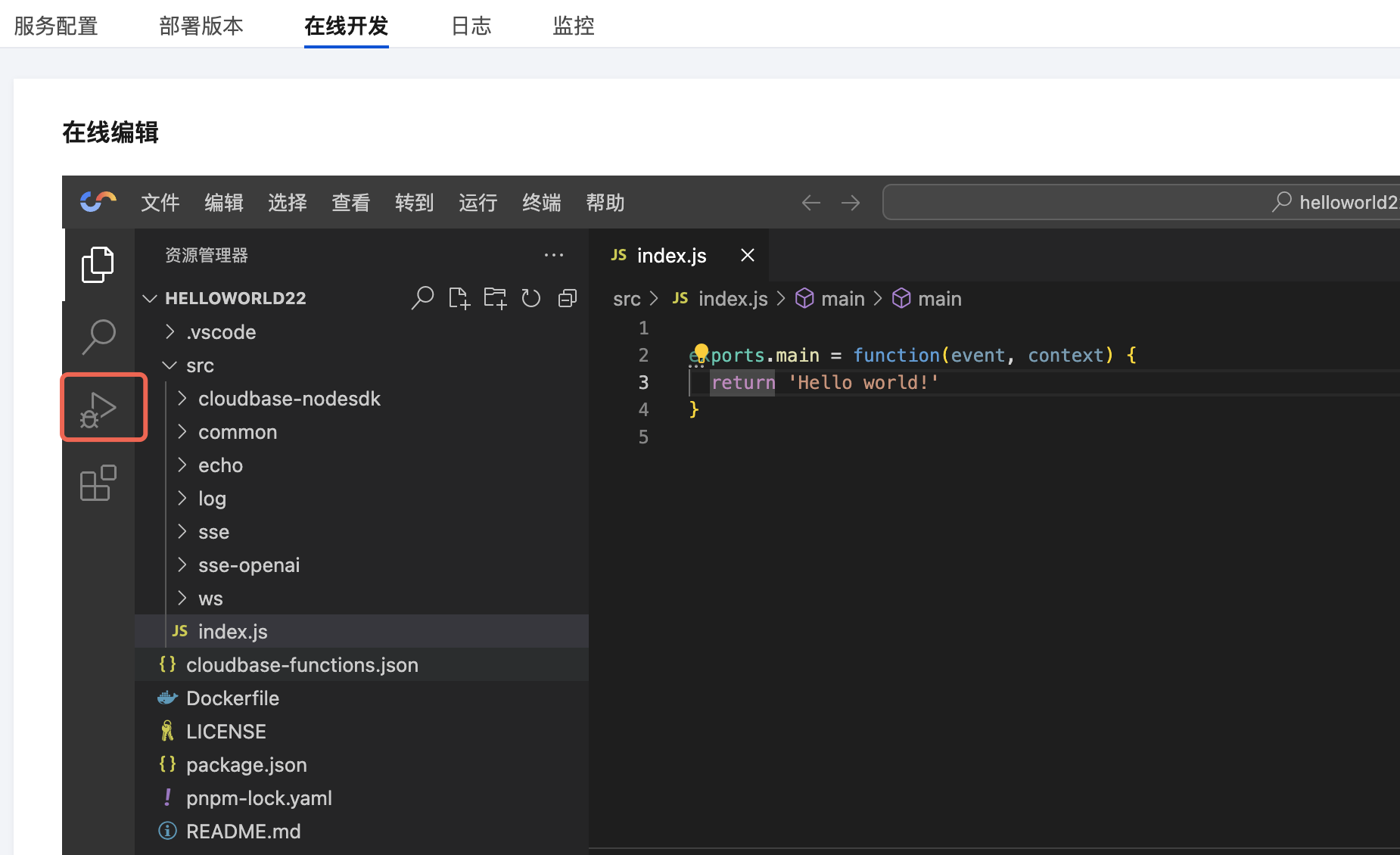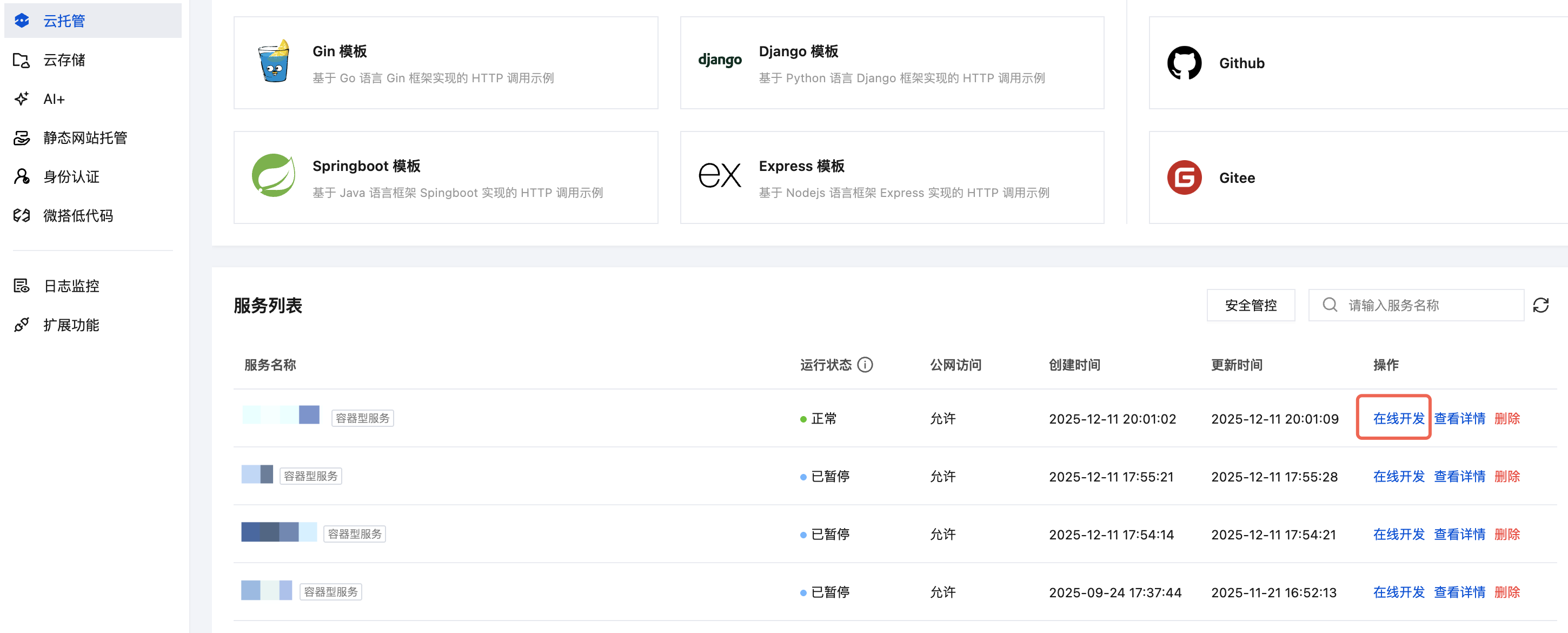 在云托管列表界面,找到您想要调试的云函数,点击其对应的「在线开发」按钮,进入 “在线开发” 模式