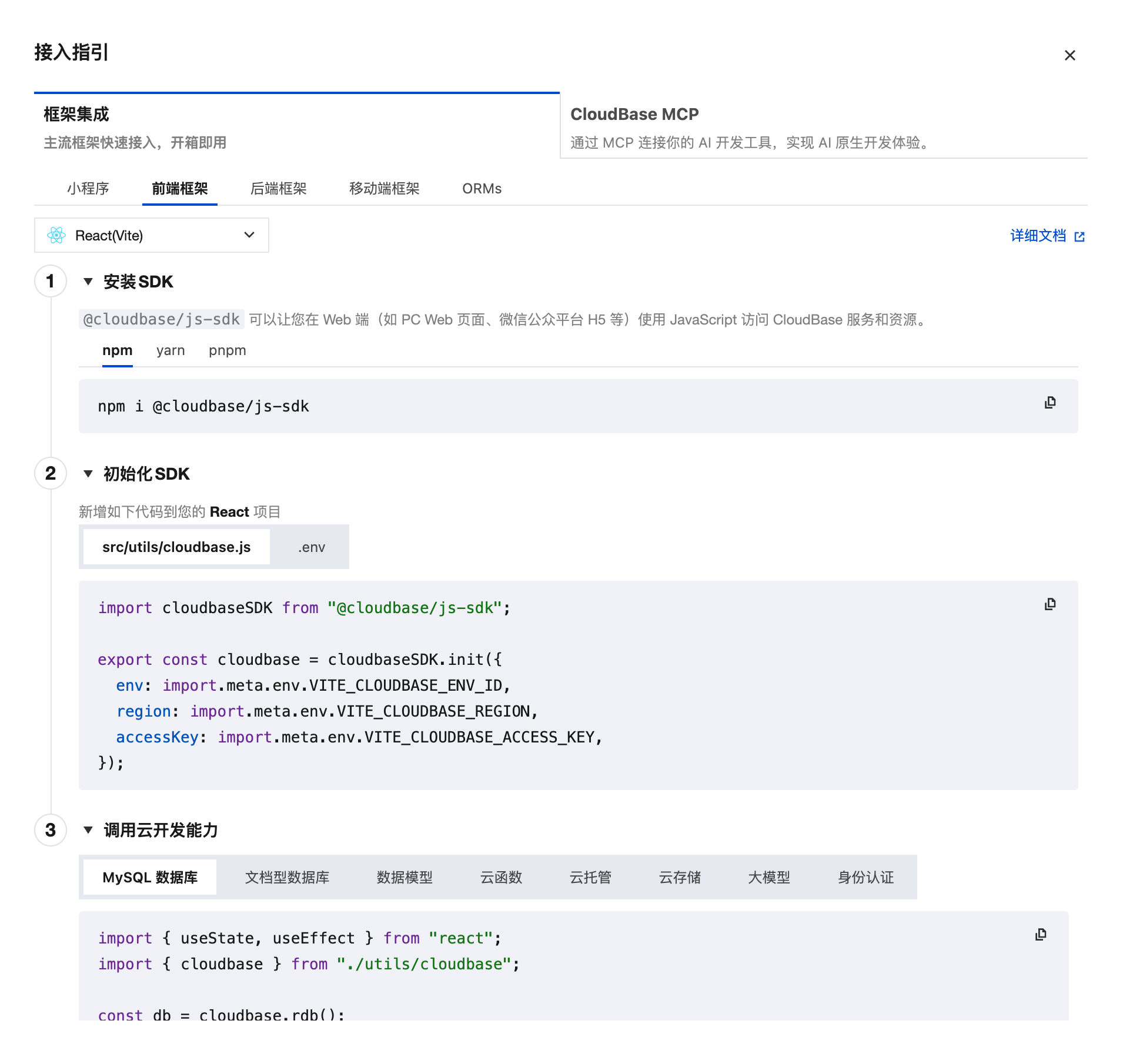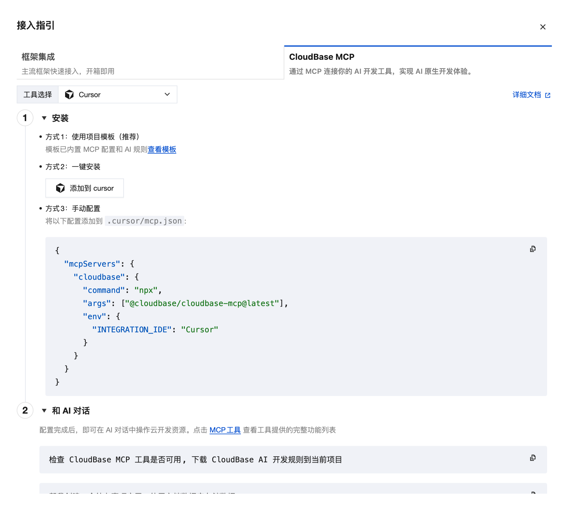 CloudBase 新增 接入指引模块,提供 React、Vue、微信小程序等主流框架的快速接入方案,以及 Cursor、WindSurf 等 AI 开发工具的 MCP 连接指引