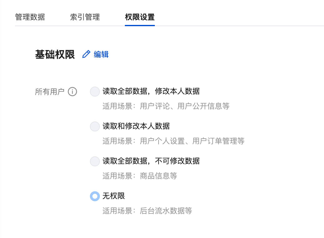 CloudBase MySQL数据库层支持配置基础的数据权限,其中分为 基础权限