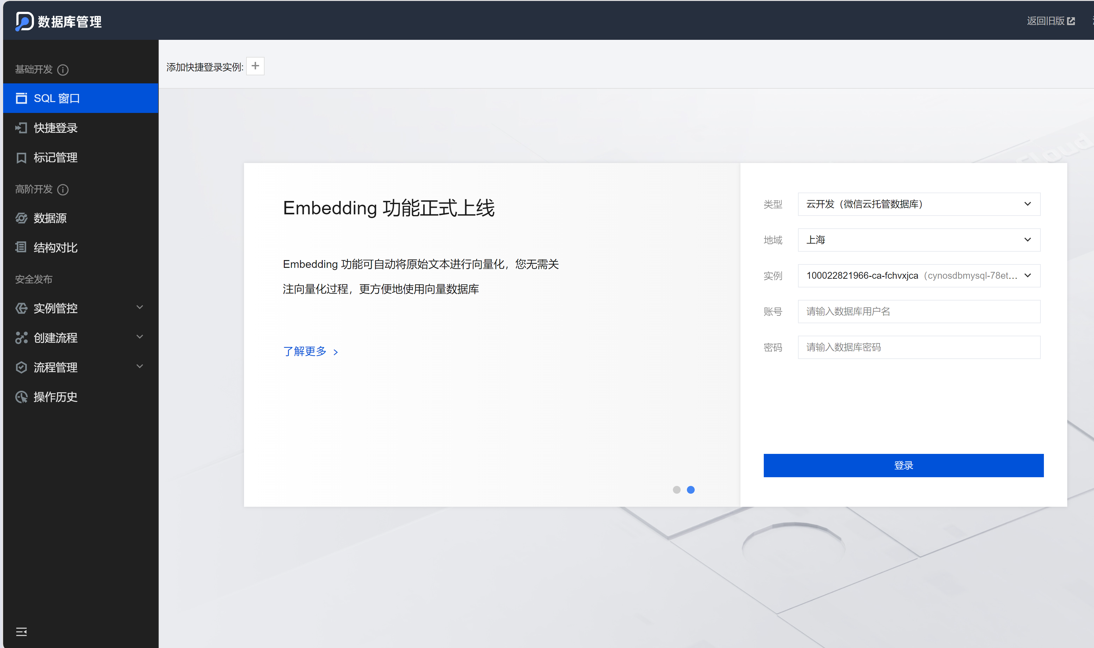 - 点击数据库配置按钮,进入 DMC 工具页面,输入之前创建的账号密码登录