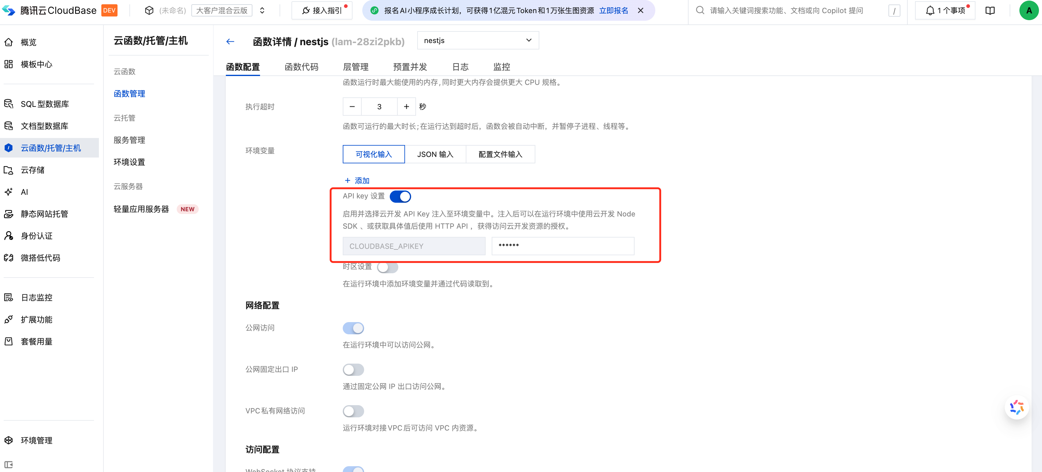 Use server API Key | No need to input in init, automatically read CLOUDBASE_APIKEY from environment variables, configure server API Key to environment variable CLOUDBASE_APIKEY |