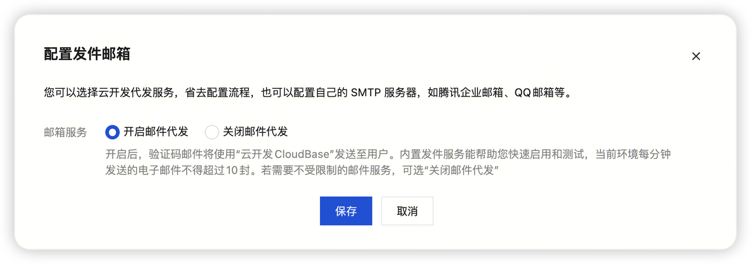 传统邮件登录需要开发者自行申请第三方邮件服务、配置 SMTP 参数,流程繁琐且易出错。现在只需在控制台点击「开启邮件代发」,即可完成配置。