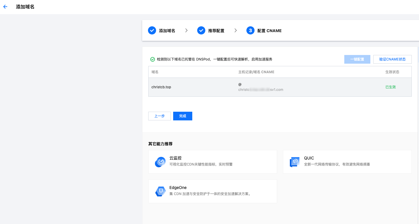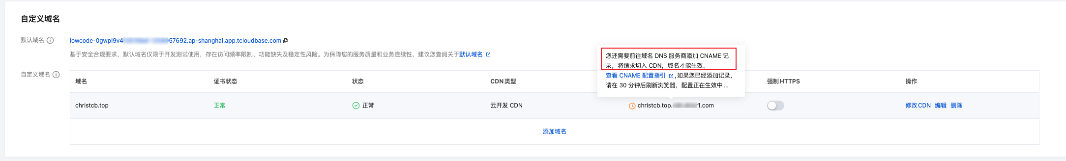 After adding a custom domain in the CloudBase platform, you need to wait for the domain association to complete, which usually takes 3-5 minutes. After successful domain association, copy the CNAME value.