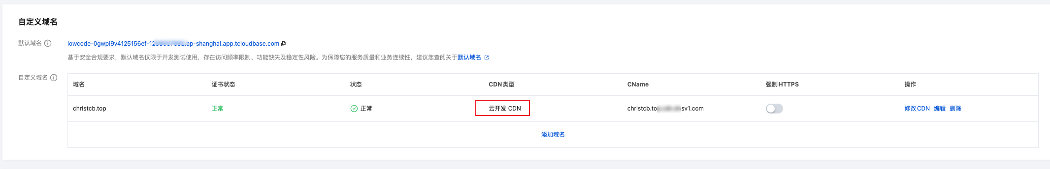 Default domains are recommended only for testing environments. To ensure business security and stability, it is recommended to bind custom domains in production environments.
