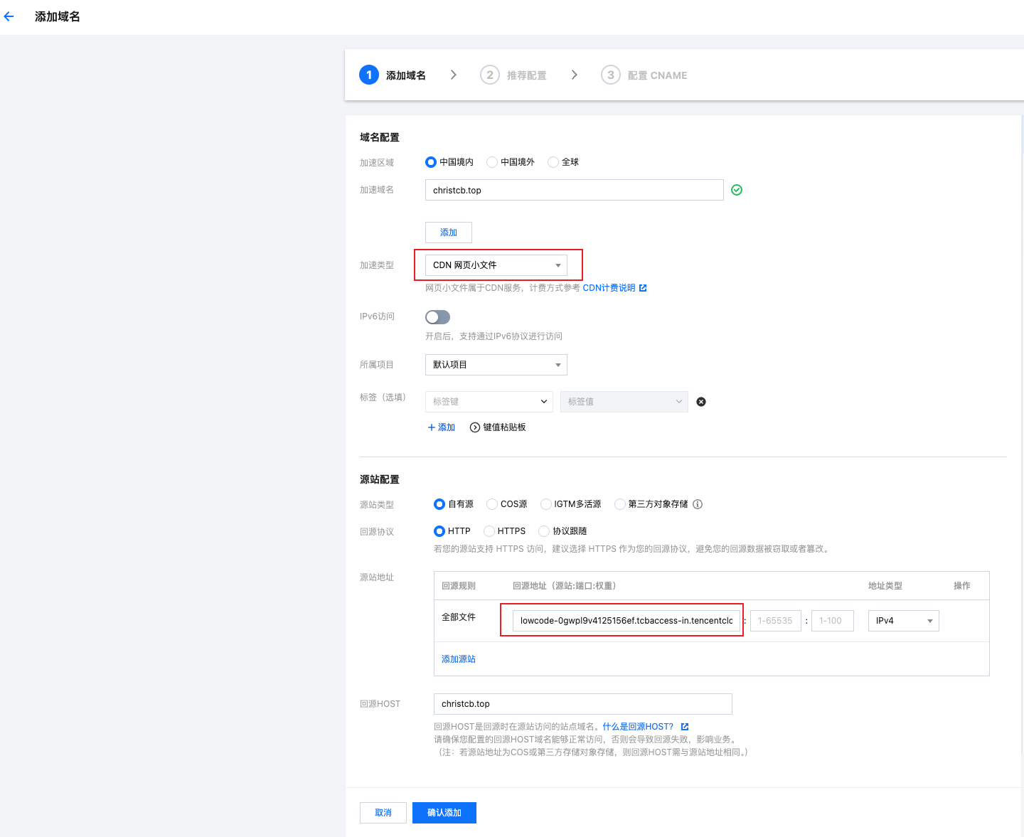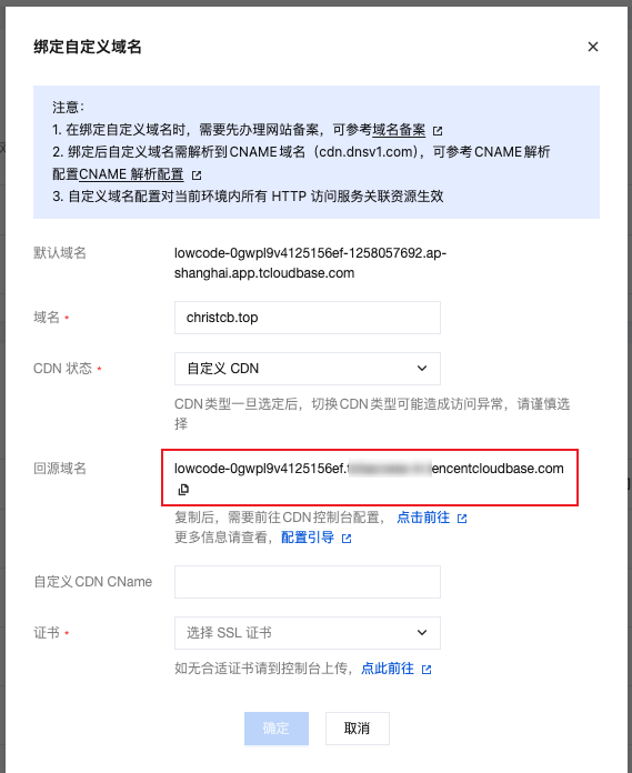 Add a custom domain in CloudBase Platform/HTTP Access Service, select Custom CDN, and copy the origin domain