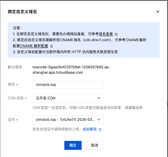 For example, if your domain is foo.com and the environment ID is bar-12345, you can set the TXT record of _cloudbase-challenge.foo.com to bar-12345.