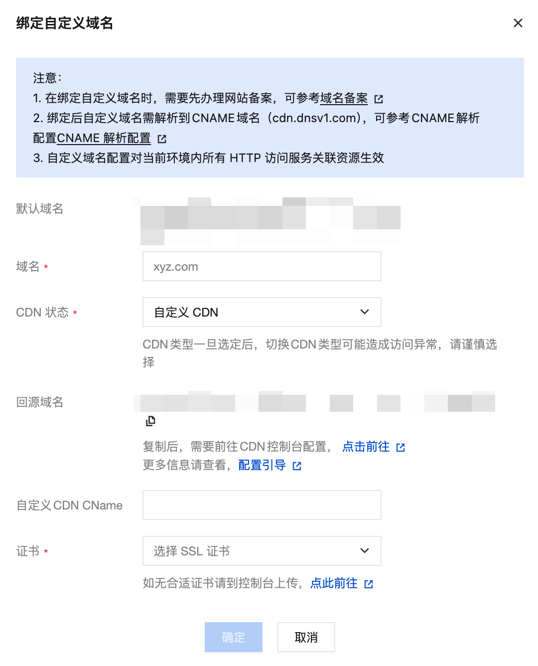 ⚠️ Note: When using Tencent Cloud CDN, you need to enter the CNAME generated in the CDN console into the custom domain CNAME field. CloudBase will verify your domain ownership.