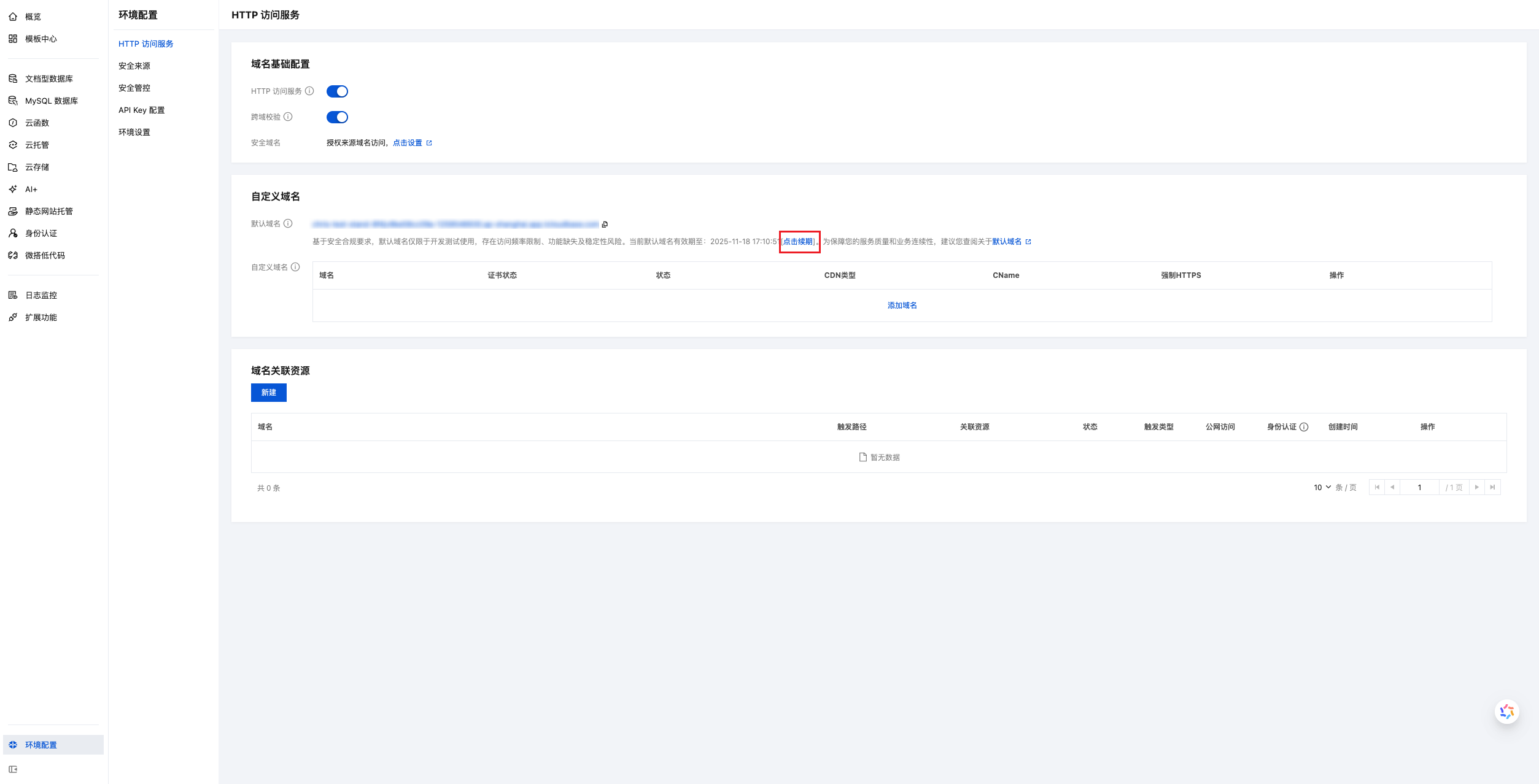 请前往云开发平台/环境配置/HTTP访问服务,点击「续期」按钮进行续期,续期预计 5 分钟内生效。