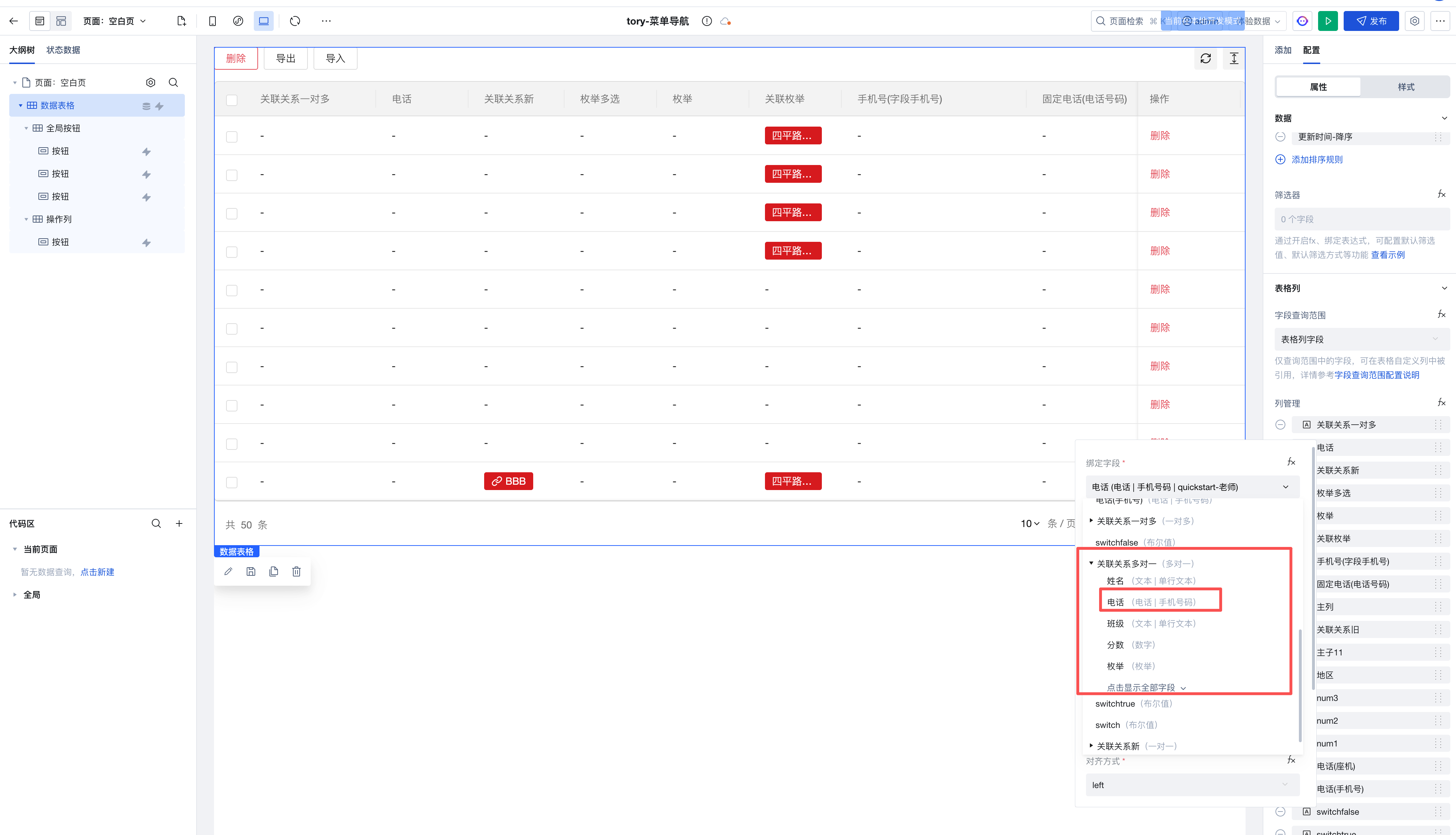 在「列管理」选择满足导出条件的关联关系模型的子字段。例如:需要导出「关联关系多对一」表中的「电话」字段。