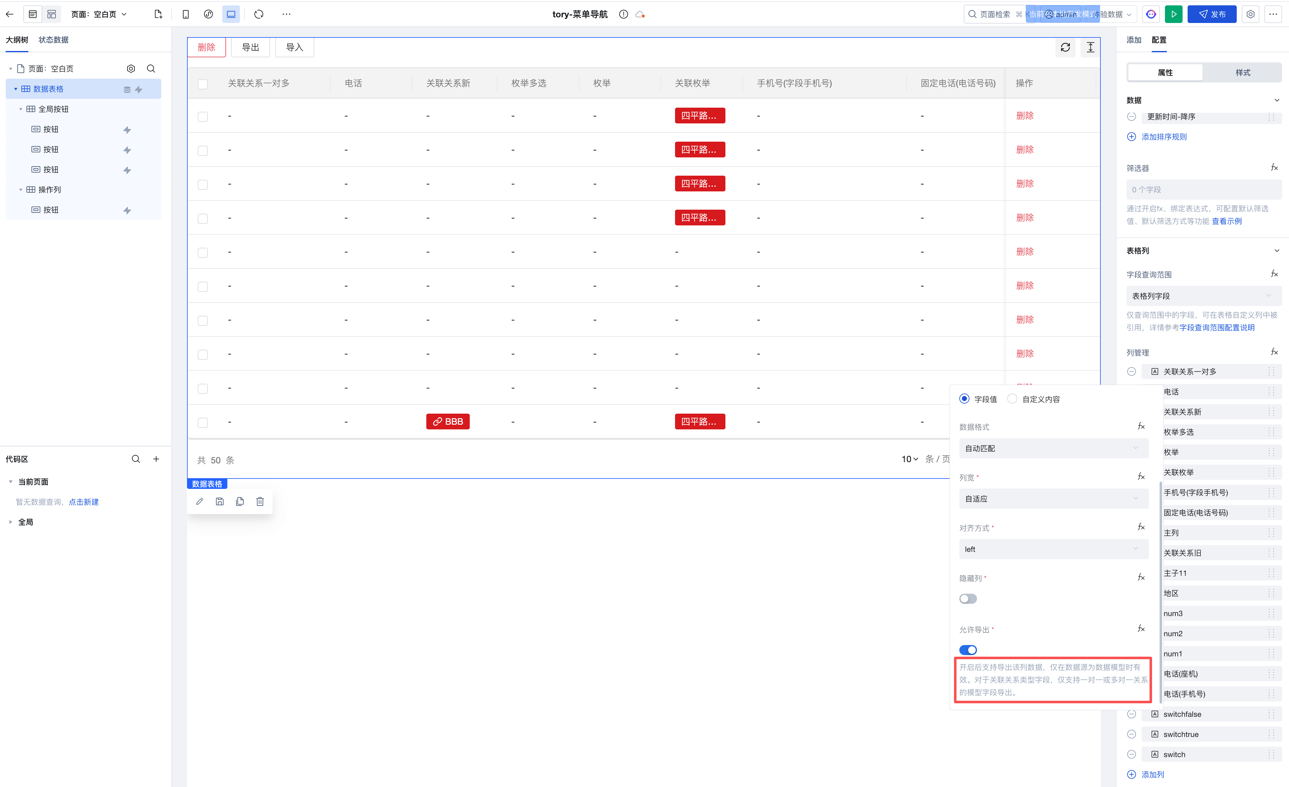 在数据源为数据模型时,对于关联关系类型字段,仅支持一对一或多对一关系的模型字段导出。 开启方式如下: