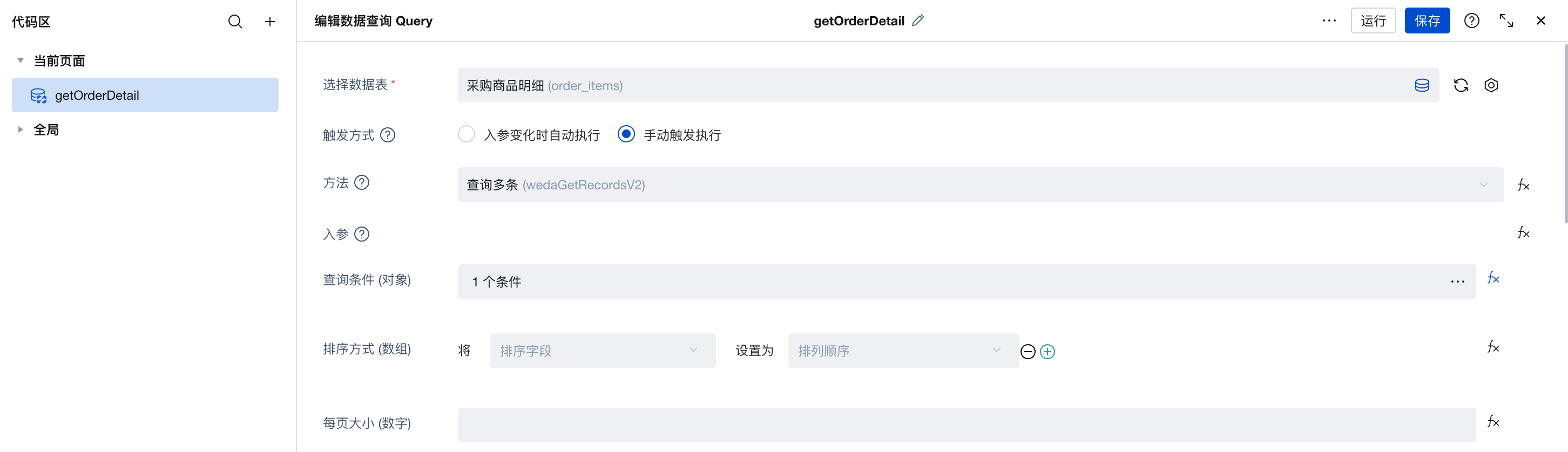 在当前页面新增一个「内置数据表查询」方法,命名为 getOrderDetail: