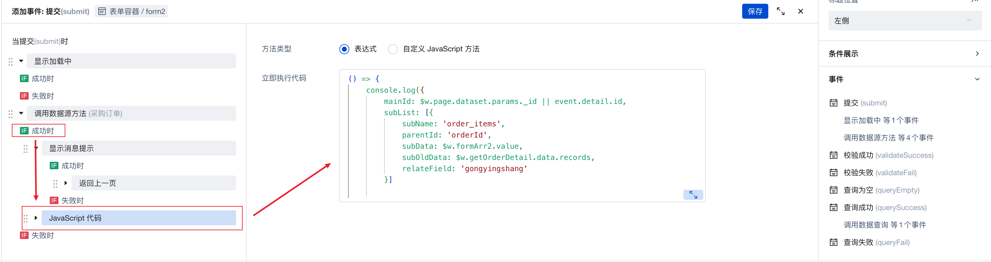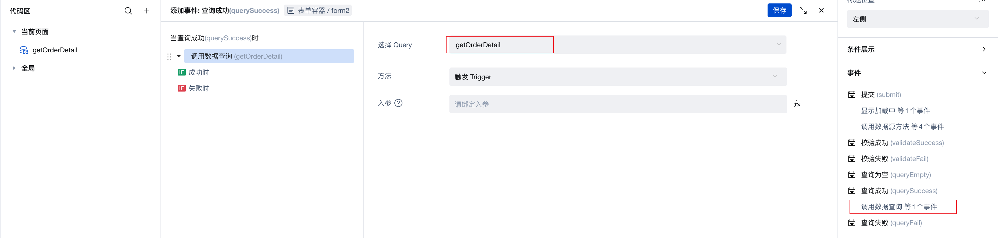 - 在编辑页面「表单容器」的 查询成功事件 中,添加执行