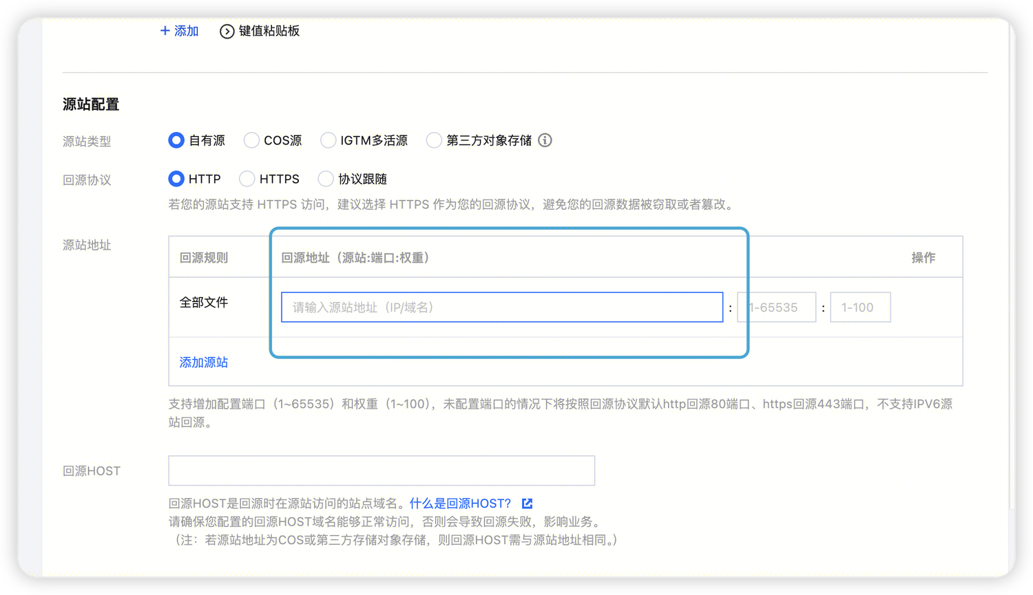 - 前往 CDN 控制台,在域名对应源站配置中填入回源域名并保存