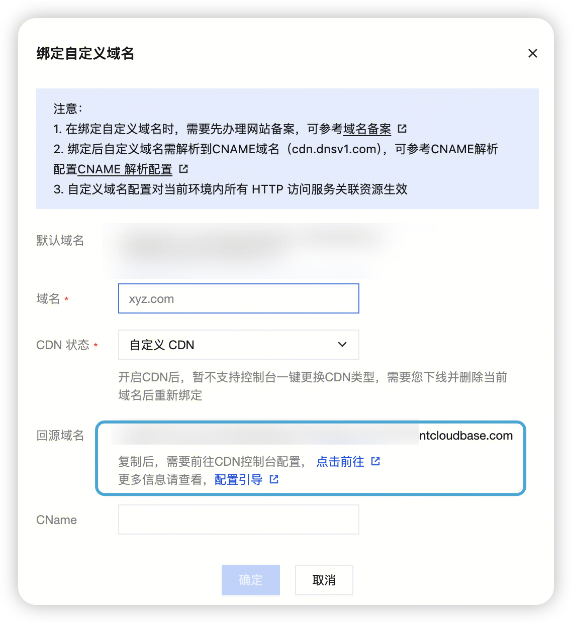 💡 注意:使用腾讯云 CDN 时,需要将 CDN 控制台生成的 CNAME 填写到自定义域名 CNAME 位置,云开发将对您的域名所有权进行校验。