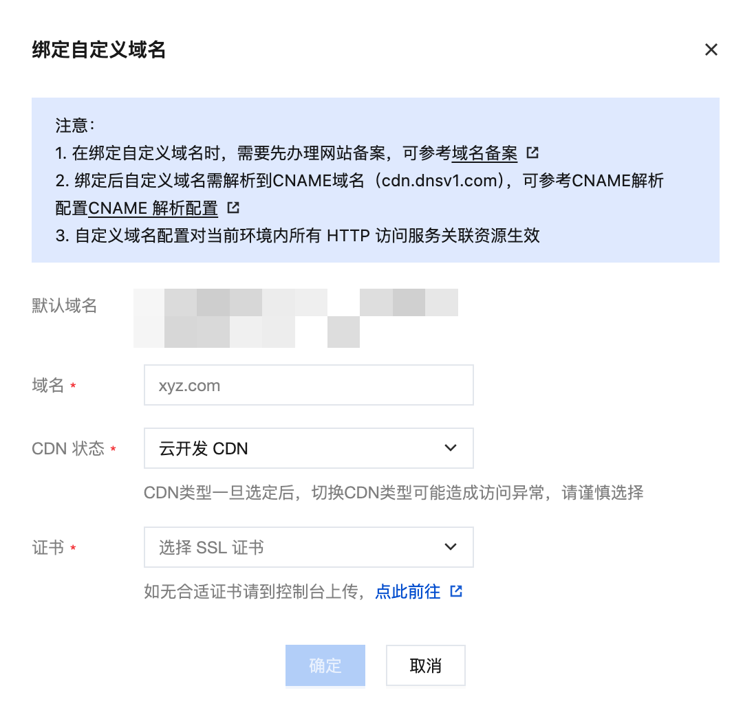 💡 注意:默认域名建议您只在测试环境中使用。为保障业务的安全性和稳定性,生产环境建议绑定自定义域名。