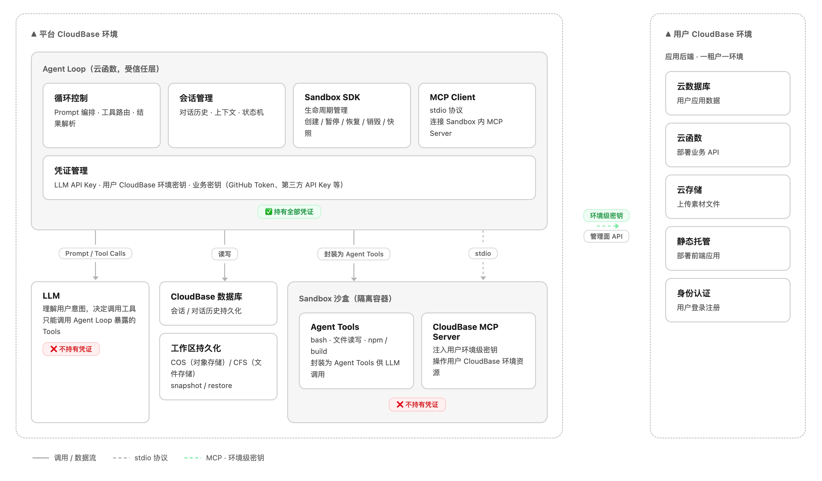 | 用户 CloudBase 环境密钥(SecretId / SecretKey) | 签发环境级临时密钥,注入 Sandbox 供 MCP 使用 |