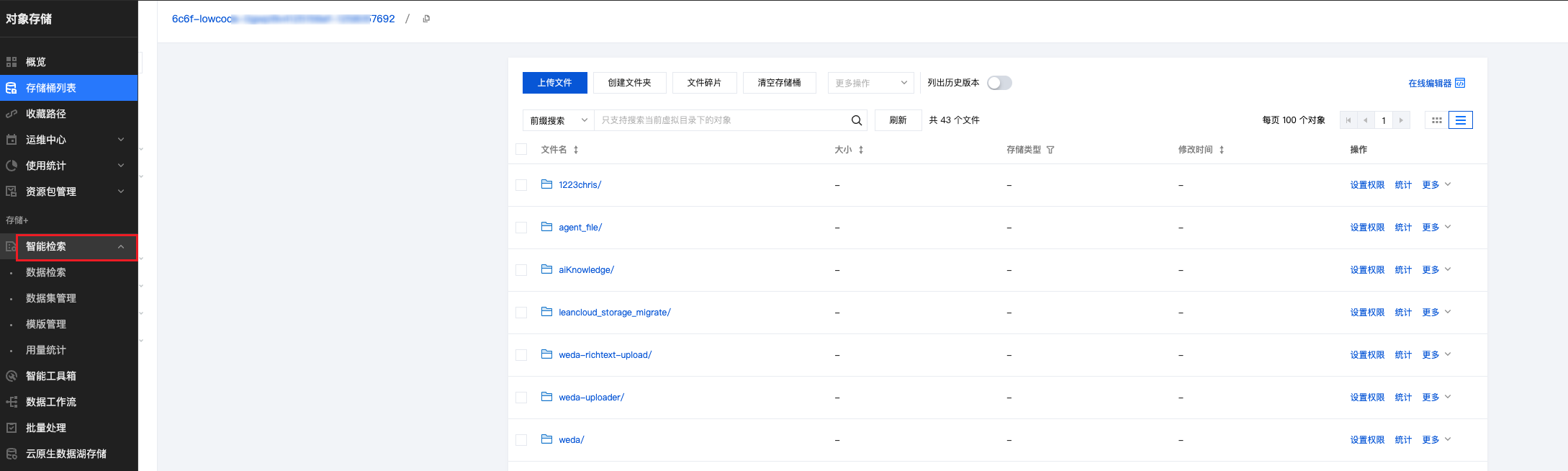 - 在 云开发平台-云存储 页面,点击「高级能力」→「智能检索」,前往COS控制台进行配置